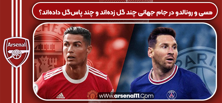 لیونل مسی مجموعا در جام های جهانی 19 بازی انجام داده و 6 گل زده و 5 پاس گل داده است. کریستیانو رونالدو 17 بازی در جام جهانی داشته است که در این بازی ها 7 گل به ثمر رسانده و 2 پاس گل داده است. در واقع رونالدو از لحاظ گلزنی آمار بهتری نسبت به مسی دارد اما پاس گل های کمتری داده است. همچنین کریستیانو رونالدو بازی های کمتری نسبت به مسی در جام جهانی داشته است.